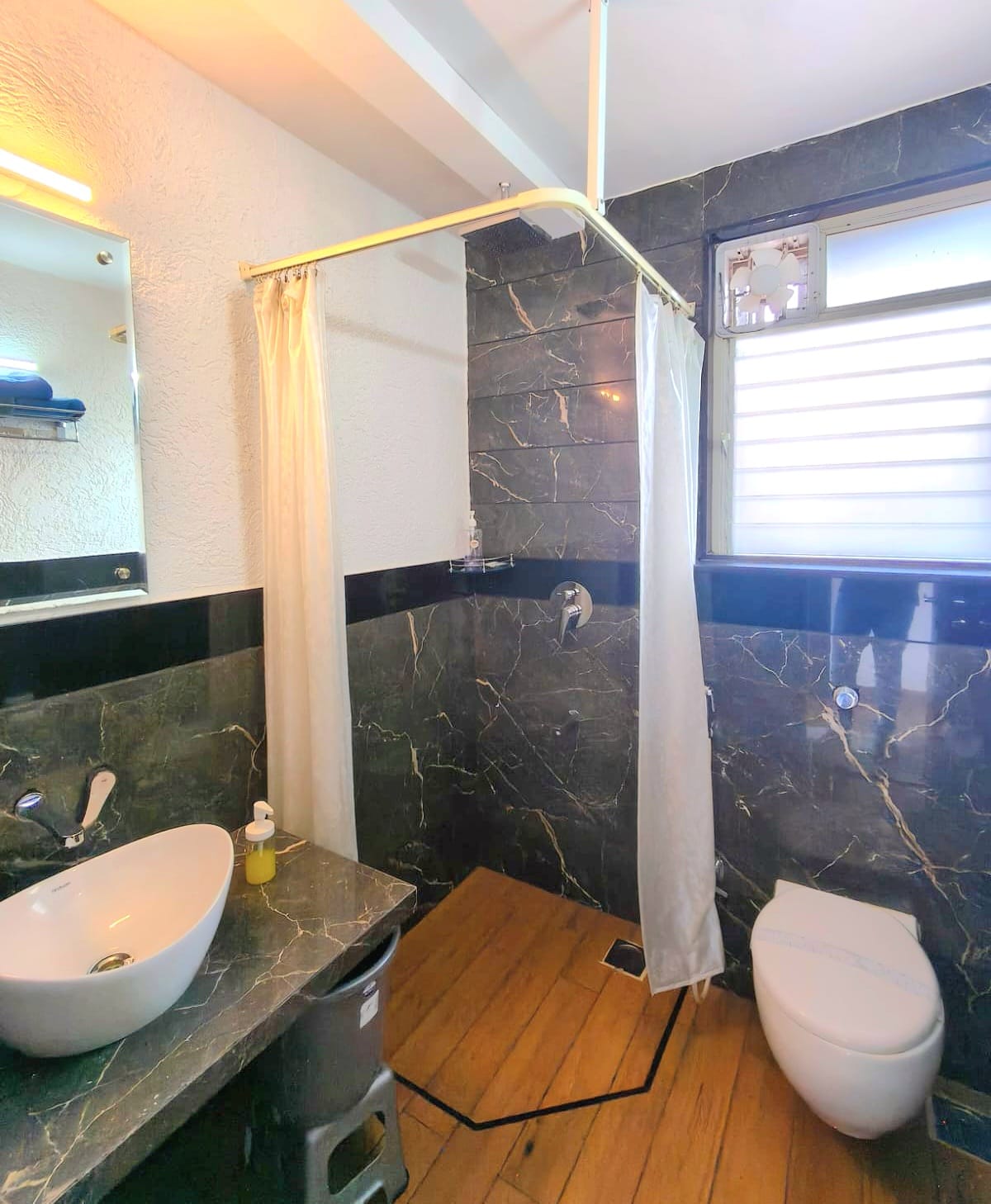 - Toilet flooring: Anti-skid flooring / vitrified tiles . Water proofing with brick bat coba.