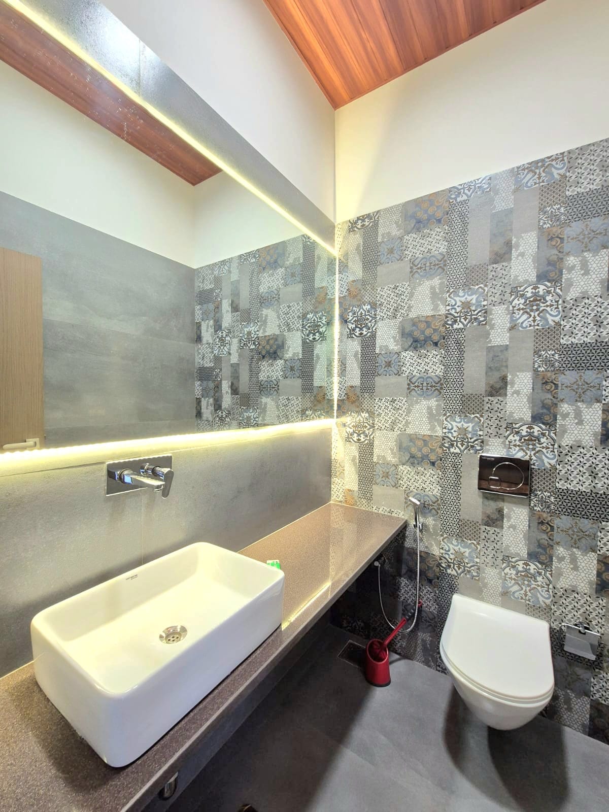 - Toilet flooring: Anti-skid flooring / vitrified tiles. Water proofing with brick bat Coba.